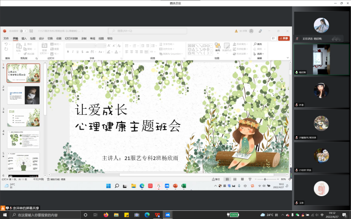 BV伟德官方网站训(撰稿:许诺)为帮助老员工对自身心理健康状况有一个正确的认识,进一步提升班级心理委员队伍工作水平,加强学院心理健康教育工作,4月27日晚上7:00时,BV伟德官方网站心理工作站组织召开了题为“让爱成长”心理健康主题线上例会,辅导员李静雯和各班级心理委员参加了会议,会议由21服艺专科2杨雨欣担任主讲、由21服工本科3班涂沣琳主持。