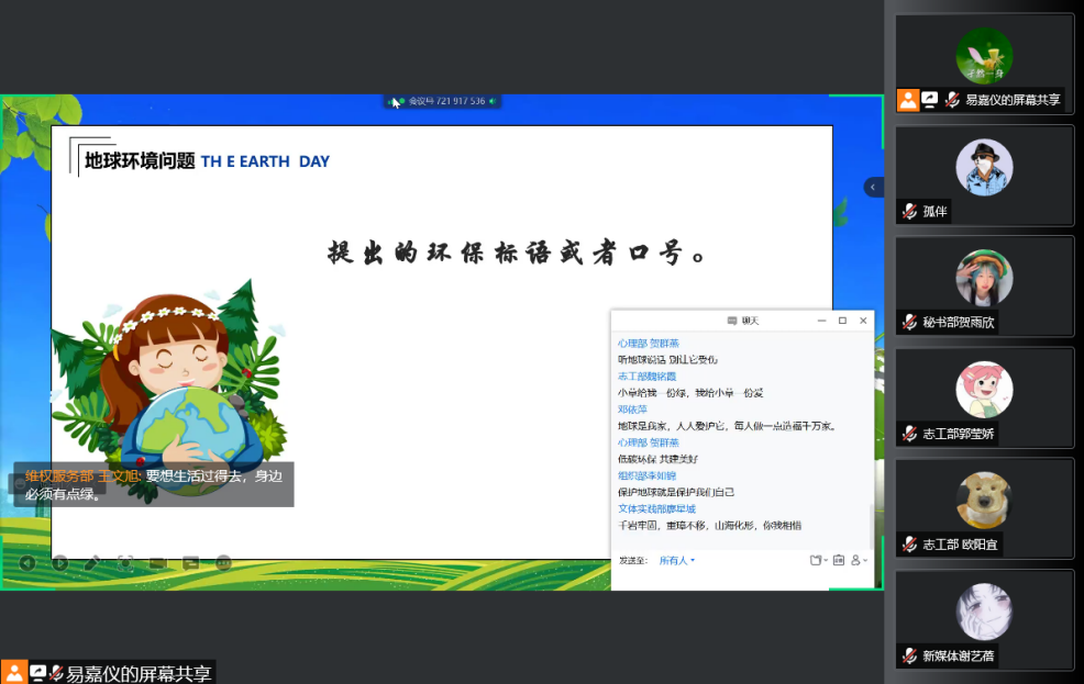 BV伟德官方网站讯(撰稿人:付菁)2022年4月22日,是第53个世界地球日。为了提高同学们的环保意识,引导同学们参与到环保活动中,倡导绿色低碳生活,改善地球的整体环境,4月22日晚7:00时,BV伟德官方网站组织了“珍爱地球,人与自然和谐共生”线上主题会议。